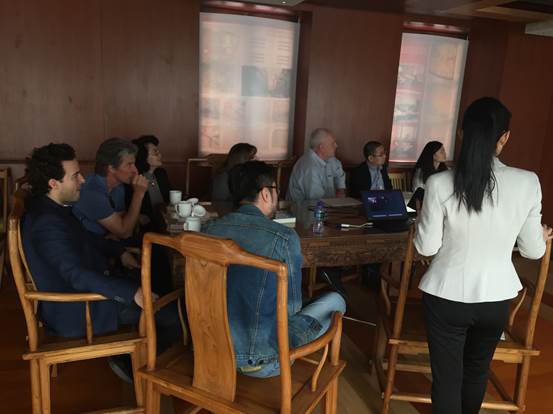 廣安置業(yè)營銷總監(jiān)沈紅梅一行向來訪人員介紹了項目的定位與特點,項目理念、設(shè)計細節(jié)以及富有民國特色的建筑風(fēng)格,得到了好萊塢電影大師的一致好評,紛紛饒有興趣的詢問相關(guān)信息、拍照留用。Jonathan Bollier表示北京坊項目令人驚艷,Phil Lengyel甚至開玩笑的表示希望能在北京坊擁有一間自己的辦公室。